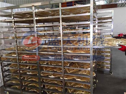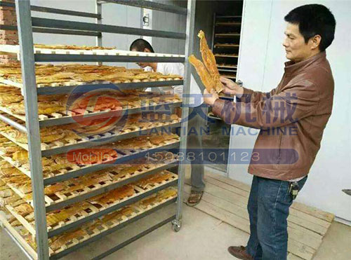 把處理過的竹筍均勻有序的擺放在不銹鋼托盤上,把推車推入烘干房內(nèi),在烘干的過程中,溫度控制在45-60度,烘干時(shí)間為48個(gè)小時(shí),直至竹筍呈金黃色就表示烘干完成,鮮筍的水份含量較大,通過壓制在烘干,時(shí)間會縮短不少。